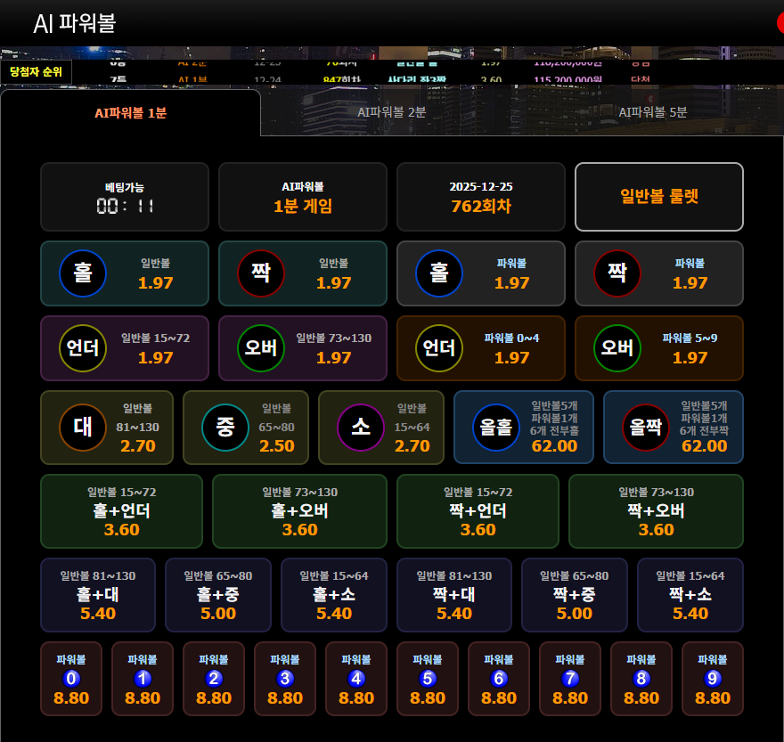 저는 그 150만 원이 하늘이 주신 마지막 기회라고 생각했습니다. 침착하게 AI파워볼 방으로 들어갔습니다. 평소 줄이 잘 나오던 패턴을 기억하며, AI가 분석해 주는 흐름에 몸을 맡겼습니다. 배당이 1.97이라 그런지 조금만 적중해도 금액이 무섭게 불어나더군요.